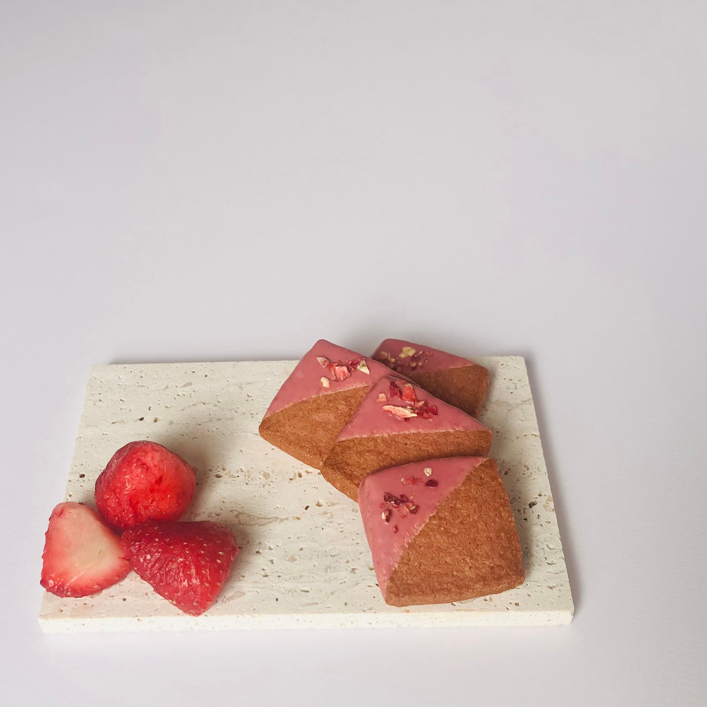 苺の甘酢っぱさを感じる生地に、軽い口触りのチョコレートをディップした春限定のクッキーです。