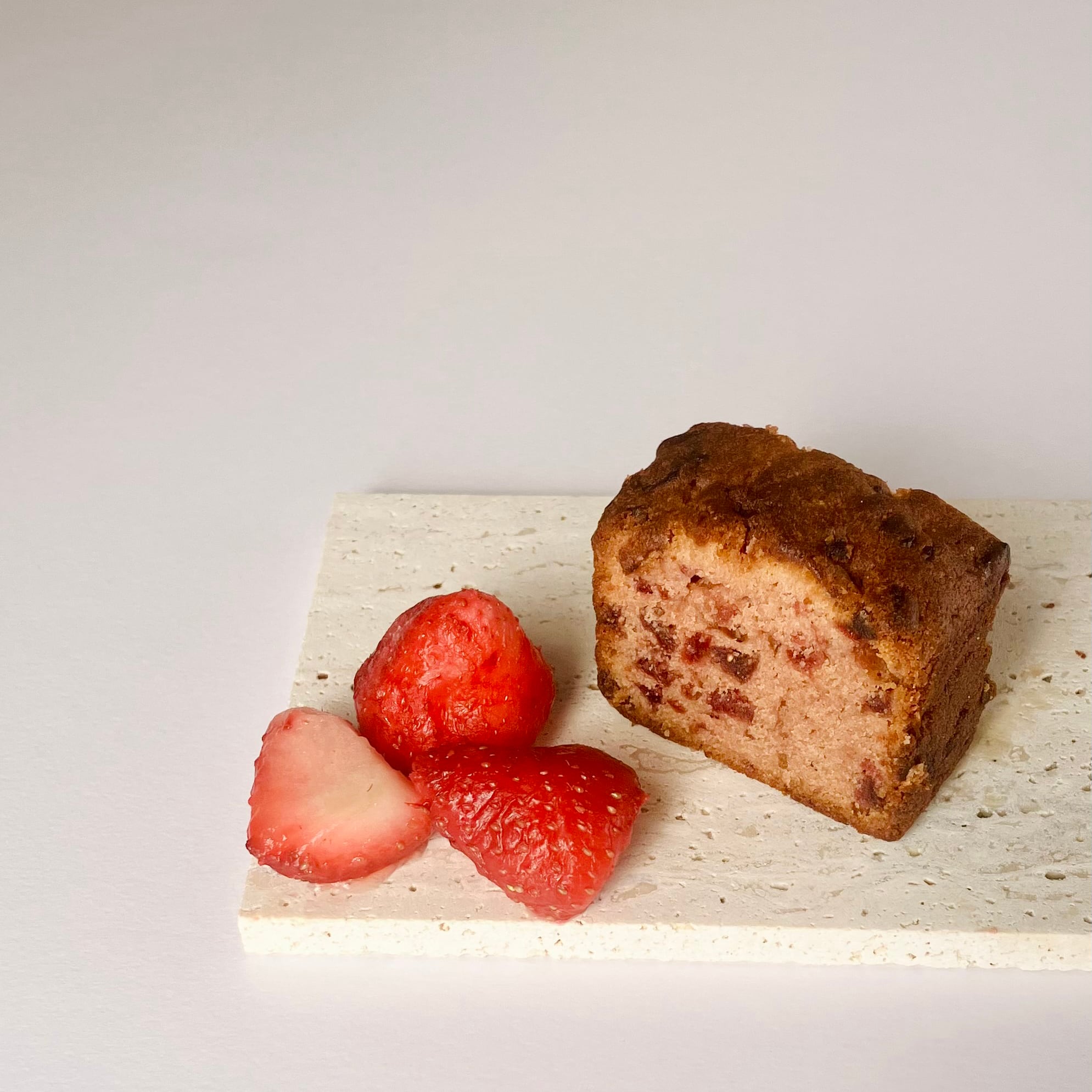 苺のほのかな甘さとフランボワーズの甘酢っぱさが口の中に広がるパウンドケーキです。
